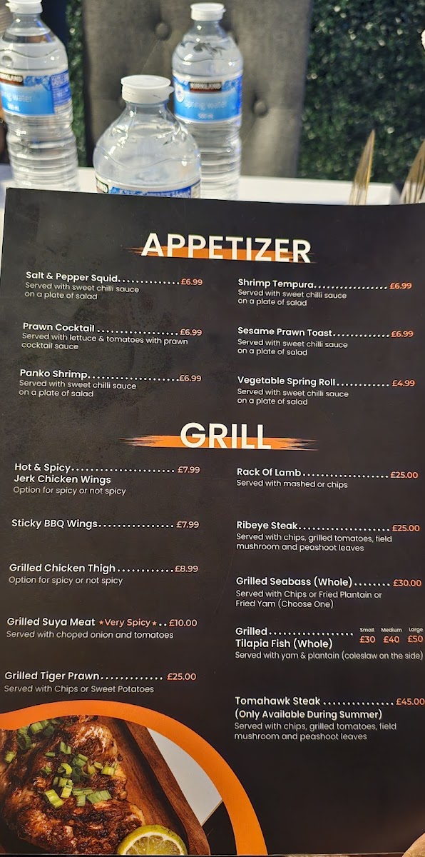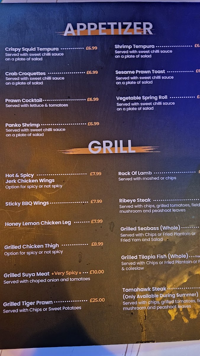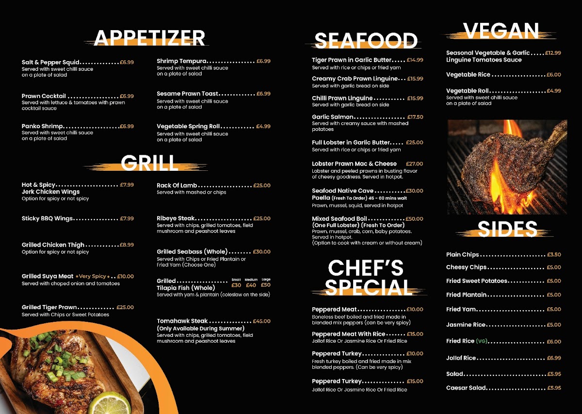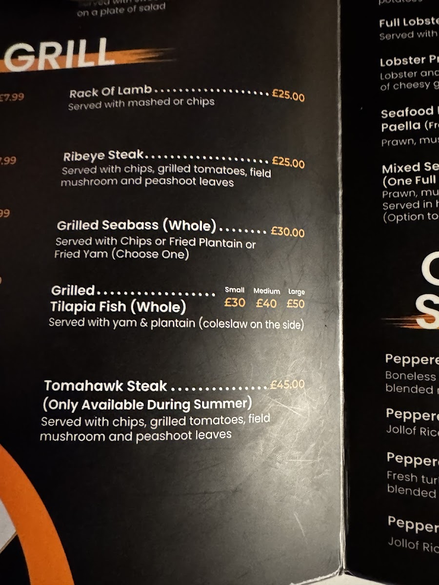 For those craving something from the grill, the Grill section boasts options like Hot & Spicy Sticky BBQ Wings, Grilled Suya Meat, Grilled Tiger Prawn, and Rack of Lamb. The Seafood menu is equally enticing, with dishes like Tiger Prawn in Garlic Butter, Chilli Crab Linguine, Creamy Prawn Linguine, Garlic Salmon, and the decadent Full Lobster in Garlic Butter.