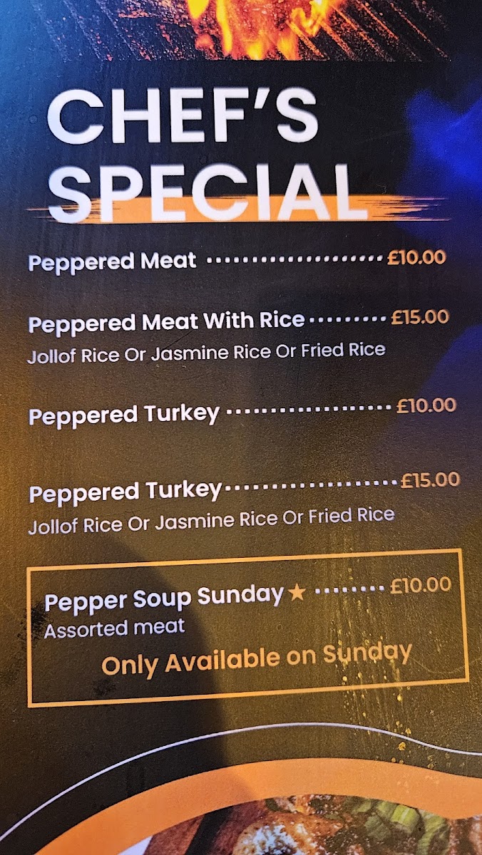 For a true taste of the chef’s expertise, the Chef's Specials feature bold, flavorful dishes like Peppered Meat & Jollof Rice and Peppered Turkey & Jollof Rice, offering a rich and hearty dining experience.